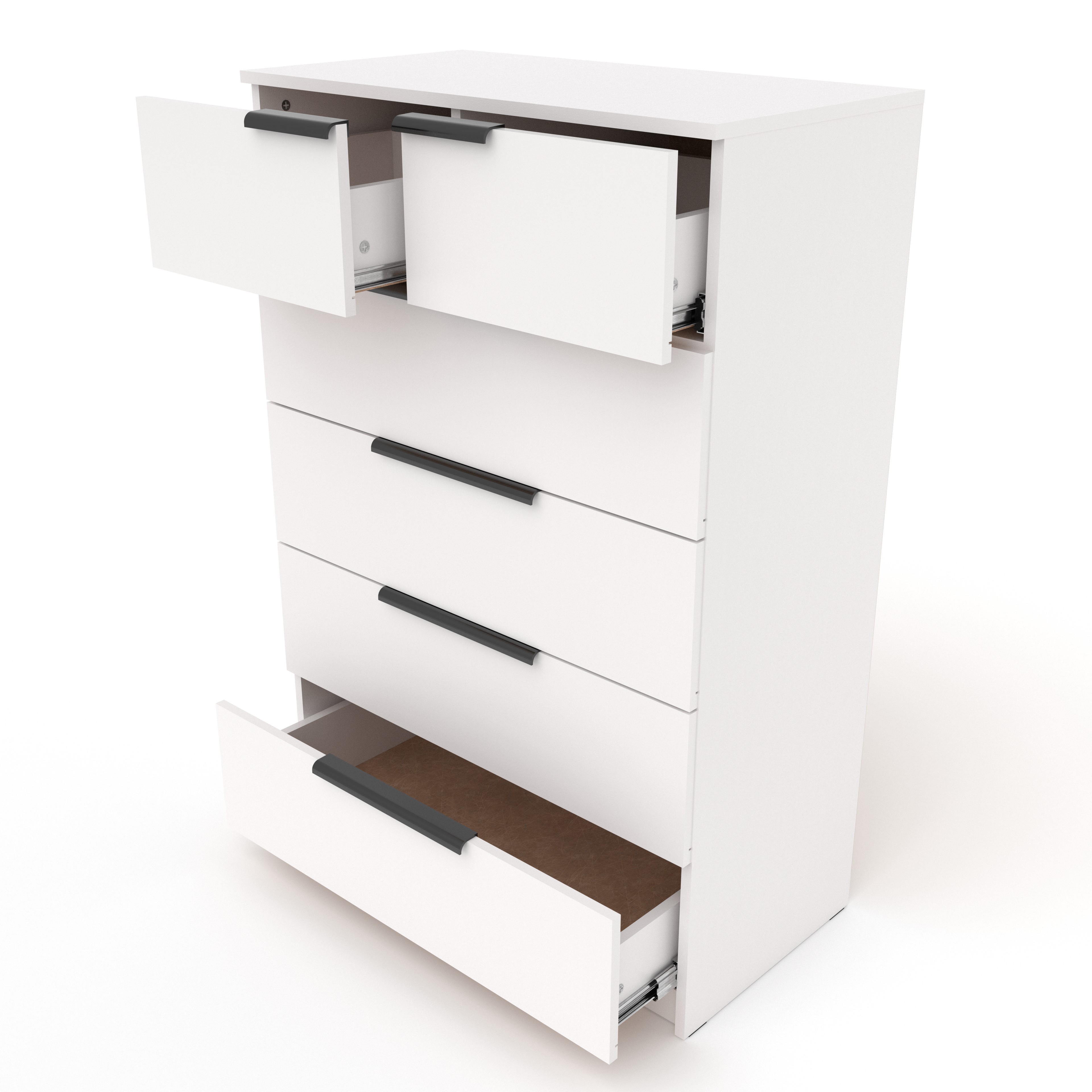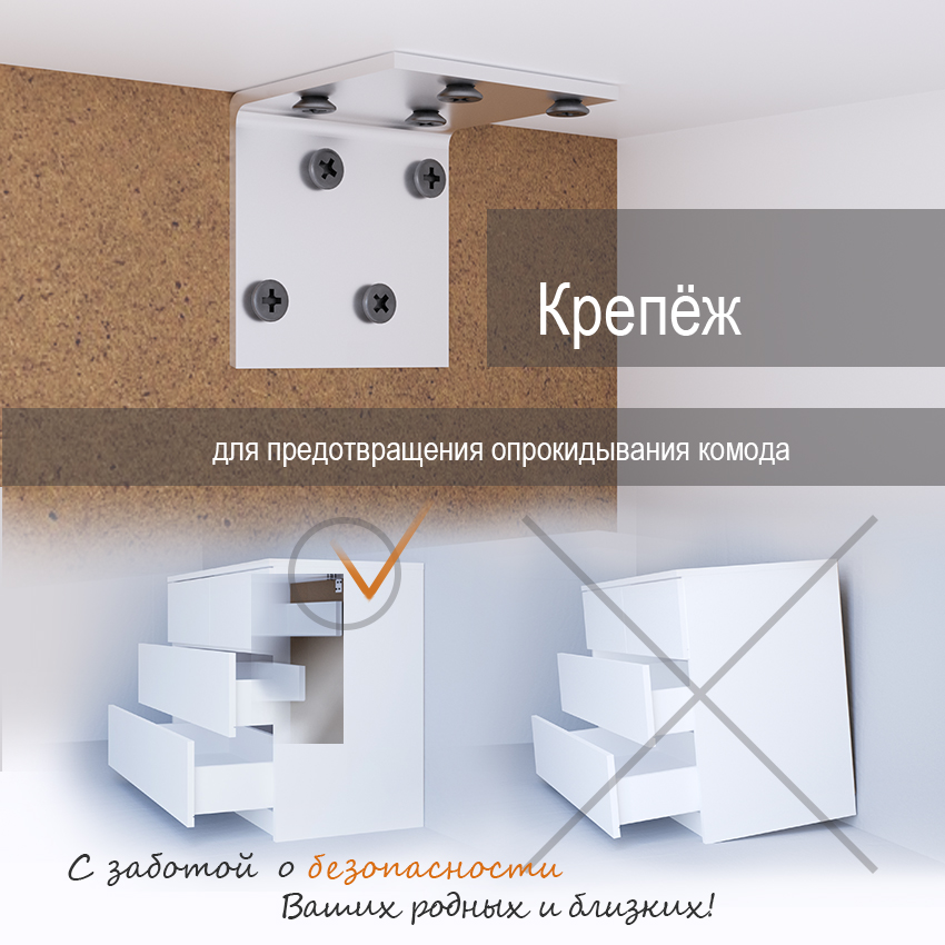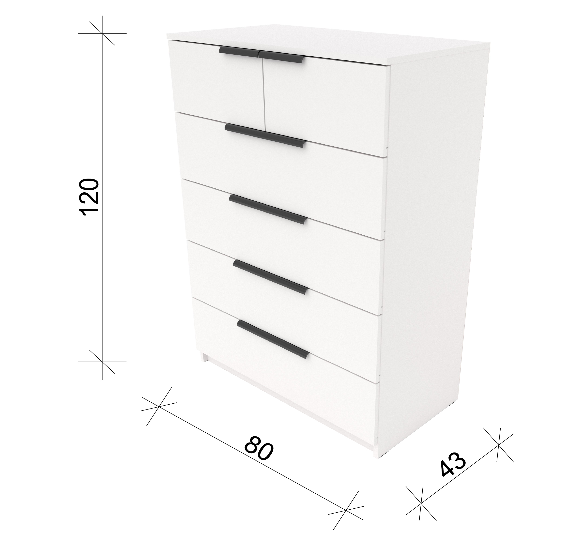 Комод оснащён шестью выдвижными ящиками разного размера: