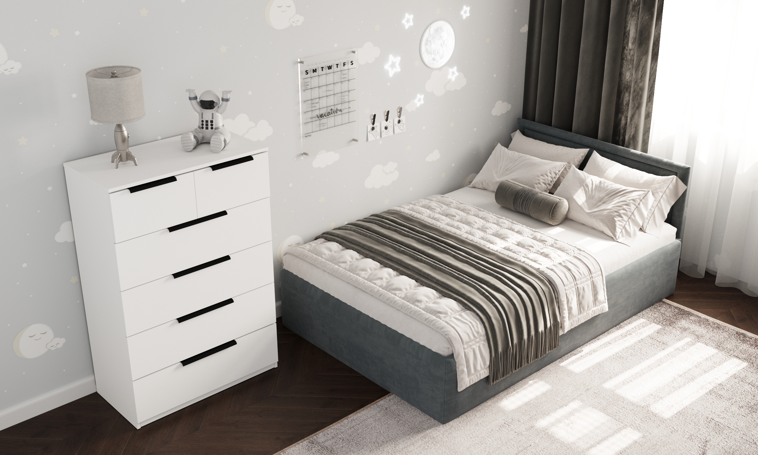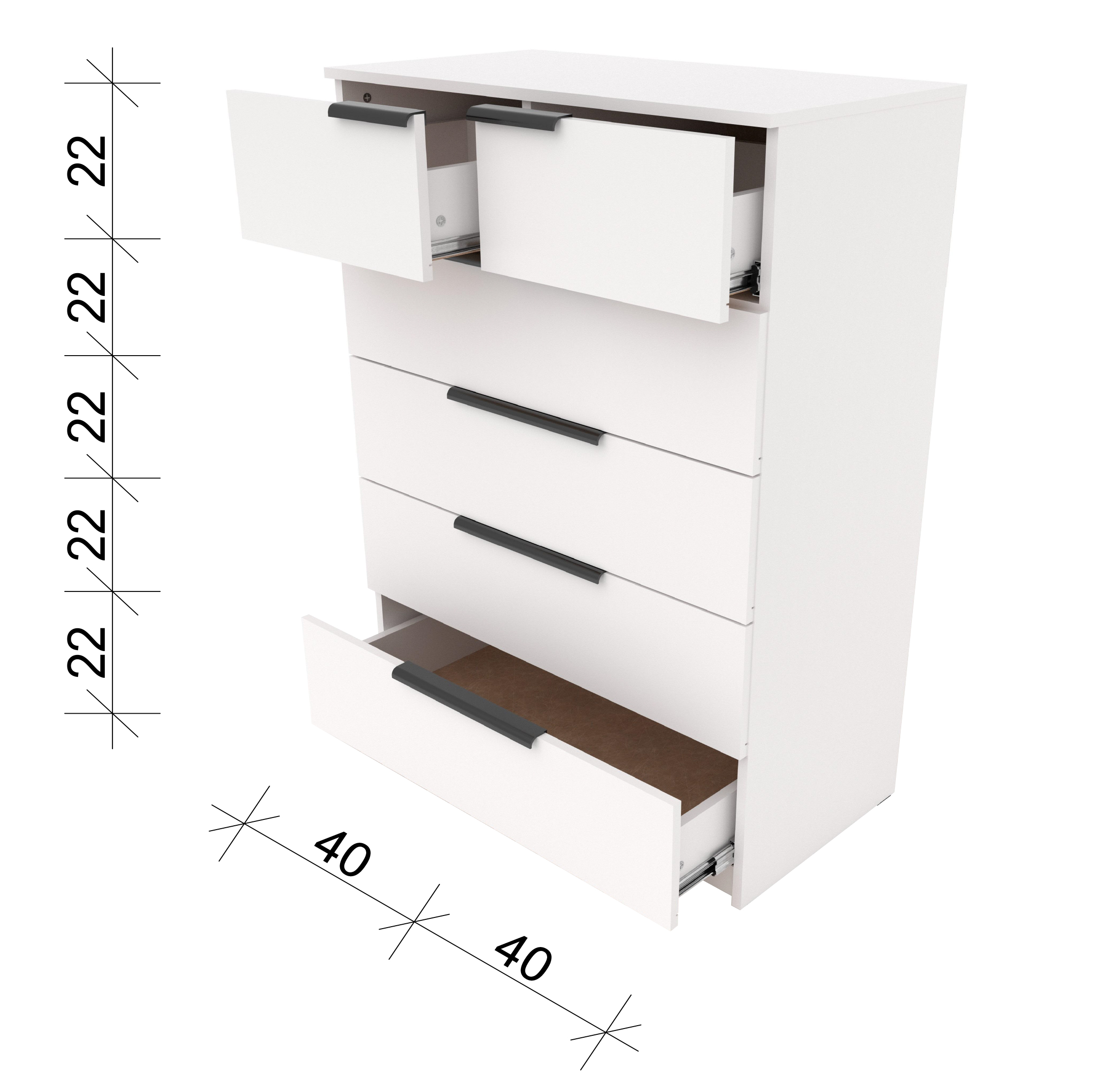- Четыре нижних ящика — полноразмерные, с глубокой посадкой и высокой грузоподъёмностью. Подойдут для хранения одежды, текстиля, книг, игрушек и других габаритных предметов. Ящики выкатываются плавно.