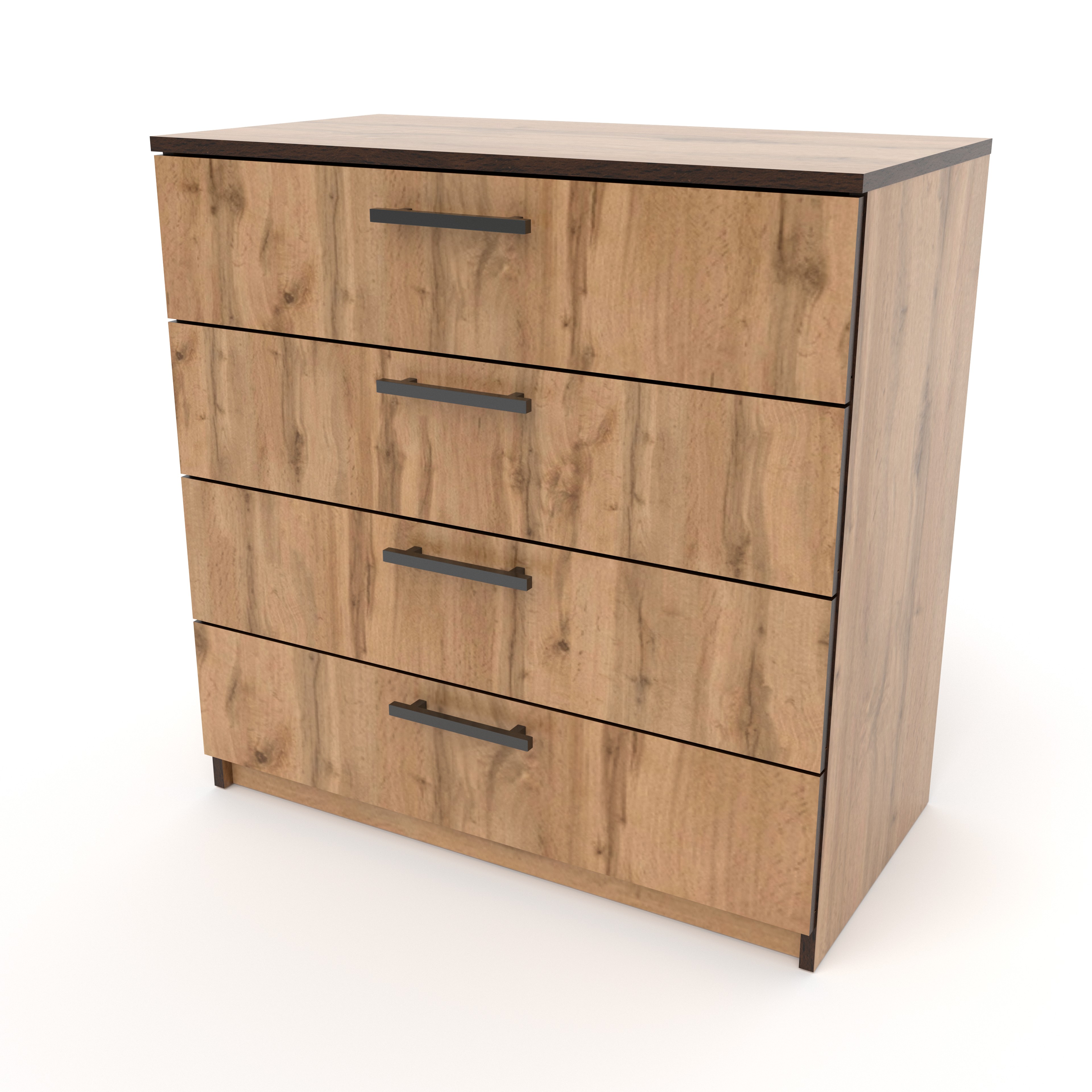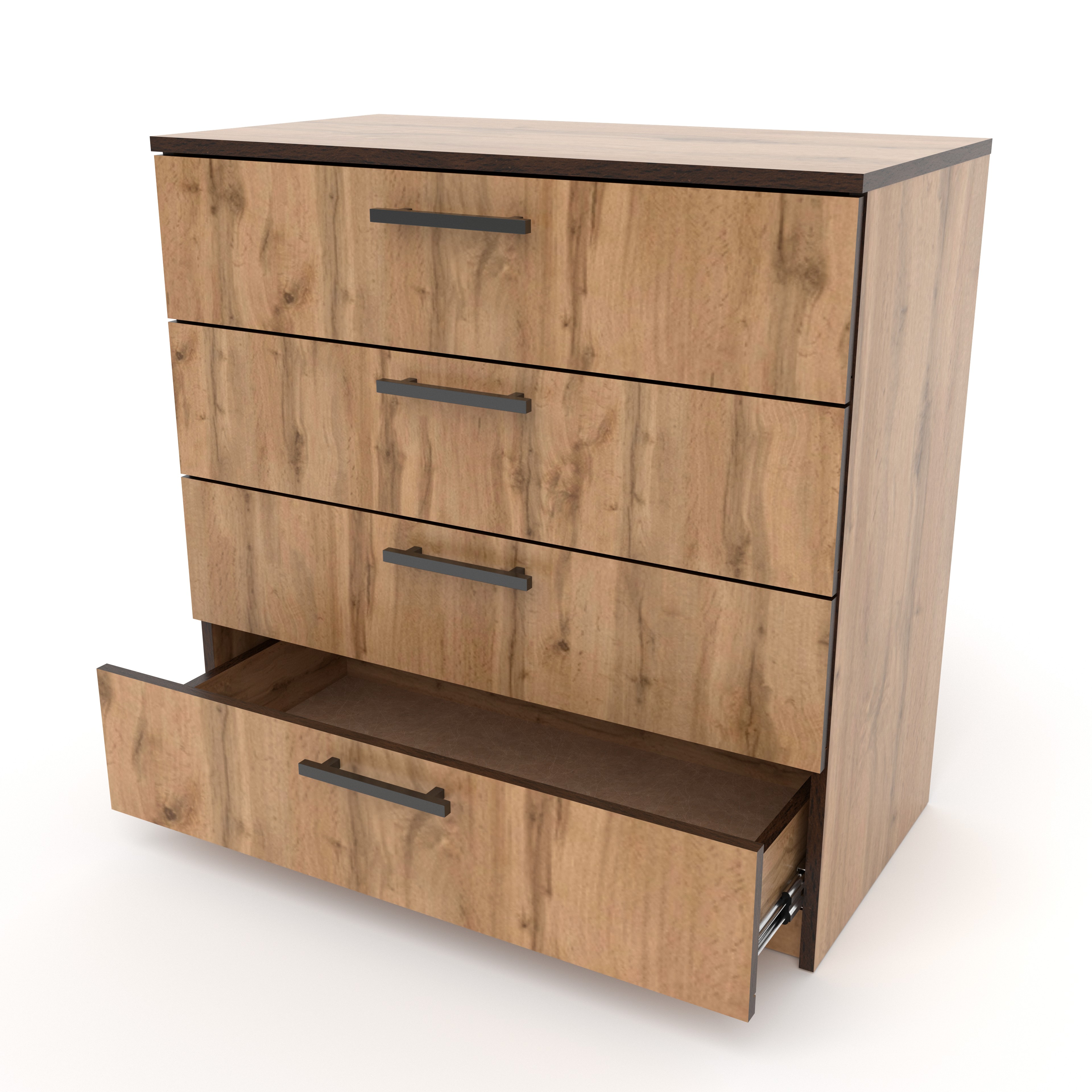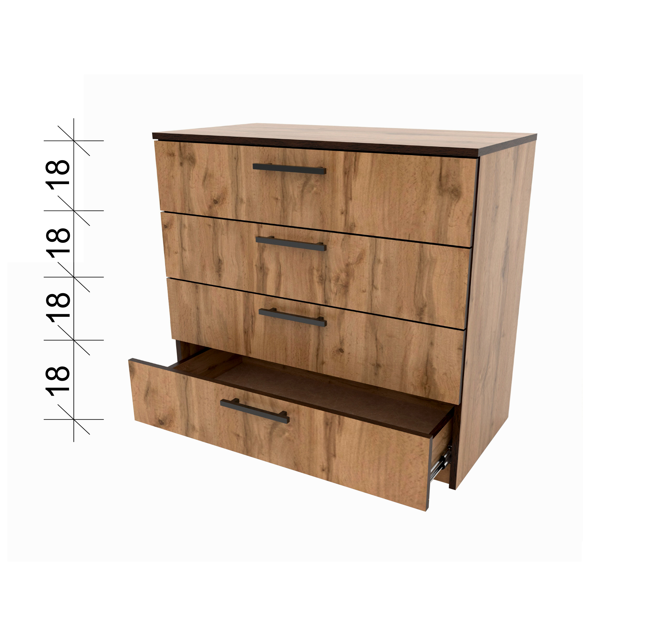 Комод оснащён четырьмя выдвижными ящиками одинакового размера: