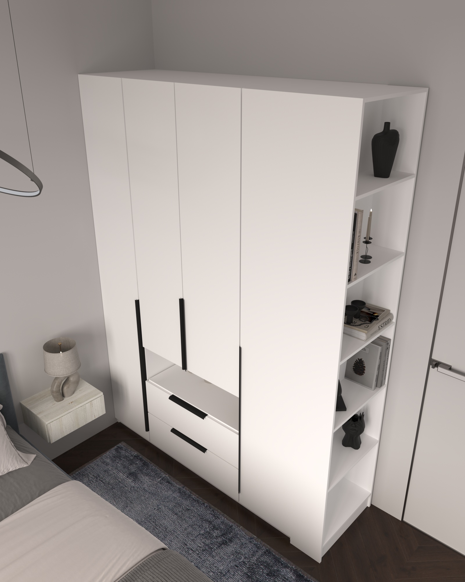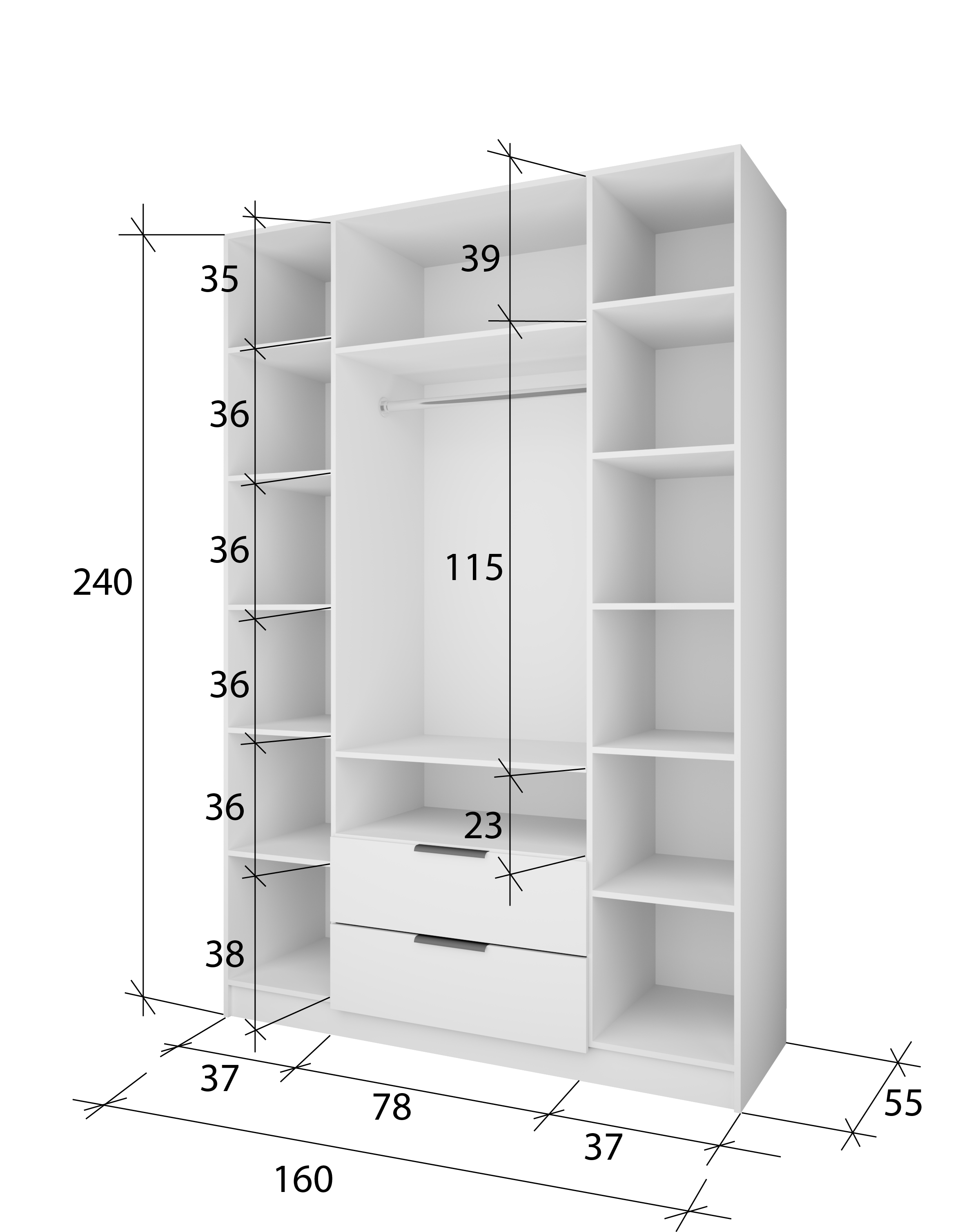 Два выдвижных ящика: Расположены в нижней части шкафа. Подходят для белья, носков, мелкой одежды или документов. Оснащены надёжными направляющими скрытого монтажа, плавно выдвигаются, выдерживают регулярную эксплуатацию, с доводчиками