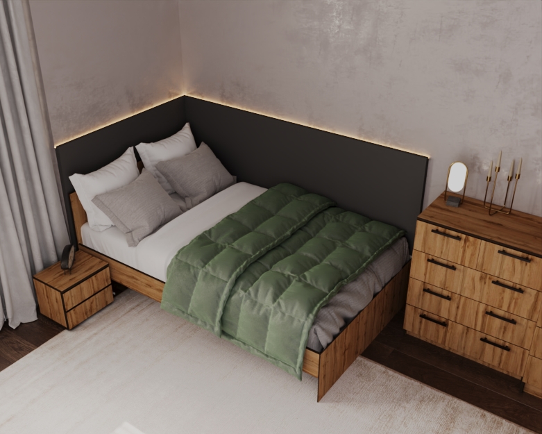 Полутороспальная кровать серии ТВОЙ —представляет собой простой минималистичный внешний вид, без лишнего декора, такой дизайн делает кровать универсальным элементом мебели, создает пространство для идеального отдыха. Внутренняя обвязка имеет несколько поперечных широких перекладин, с центральной опорой.