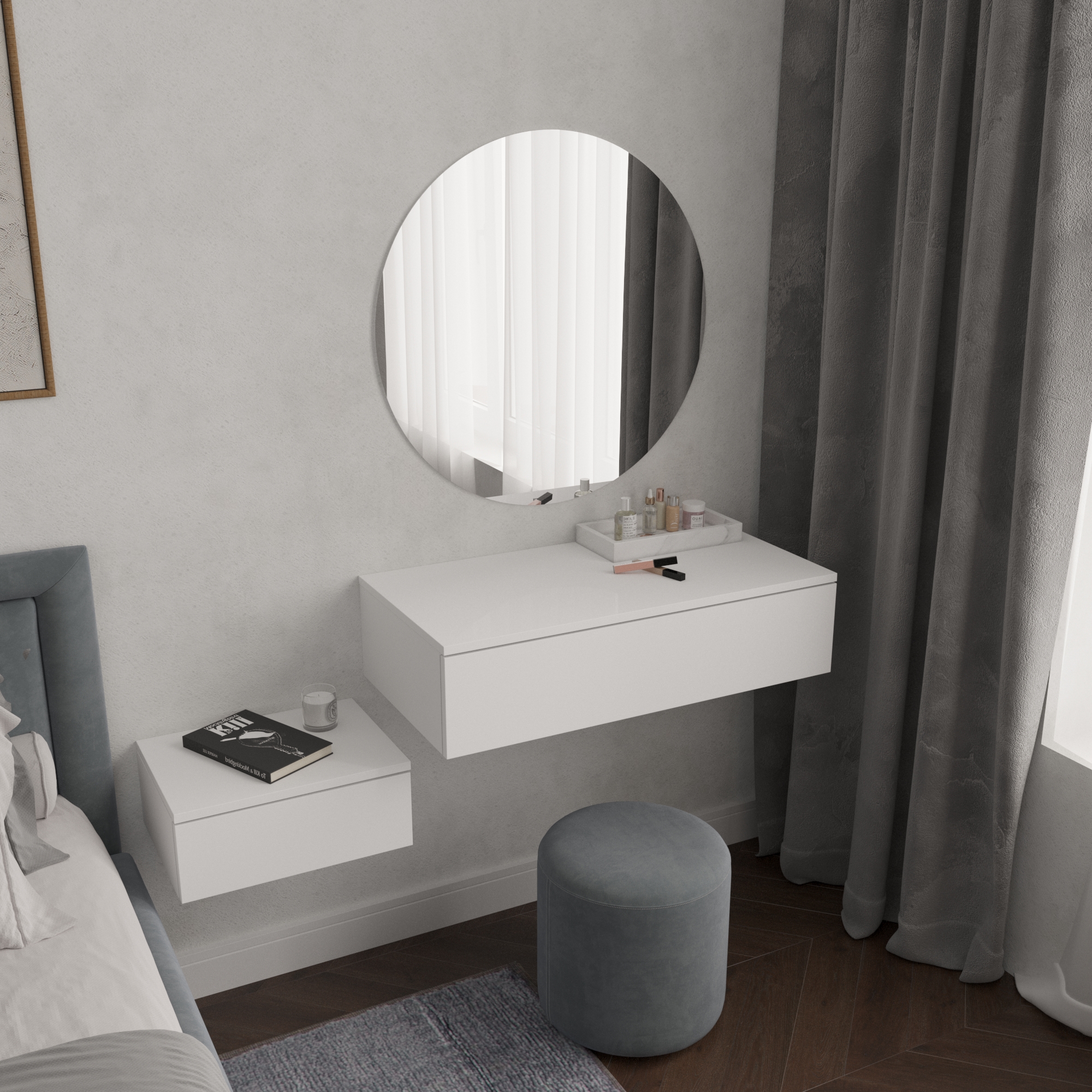 Подвесной туалетный столик — это компактное и современное решение для организации бьюти-зоны, которое крепится непосредственно к стене, не имея опорных ножек. Такая конструкция создает эффект «парения», визуально разгружает пространство и идеально подходит для небольших спален или прихожих.