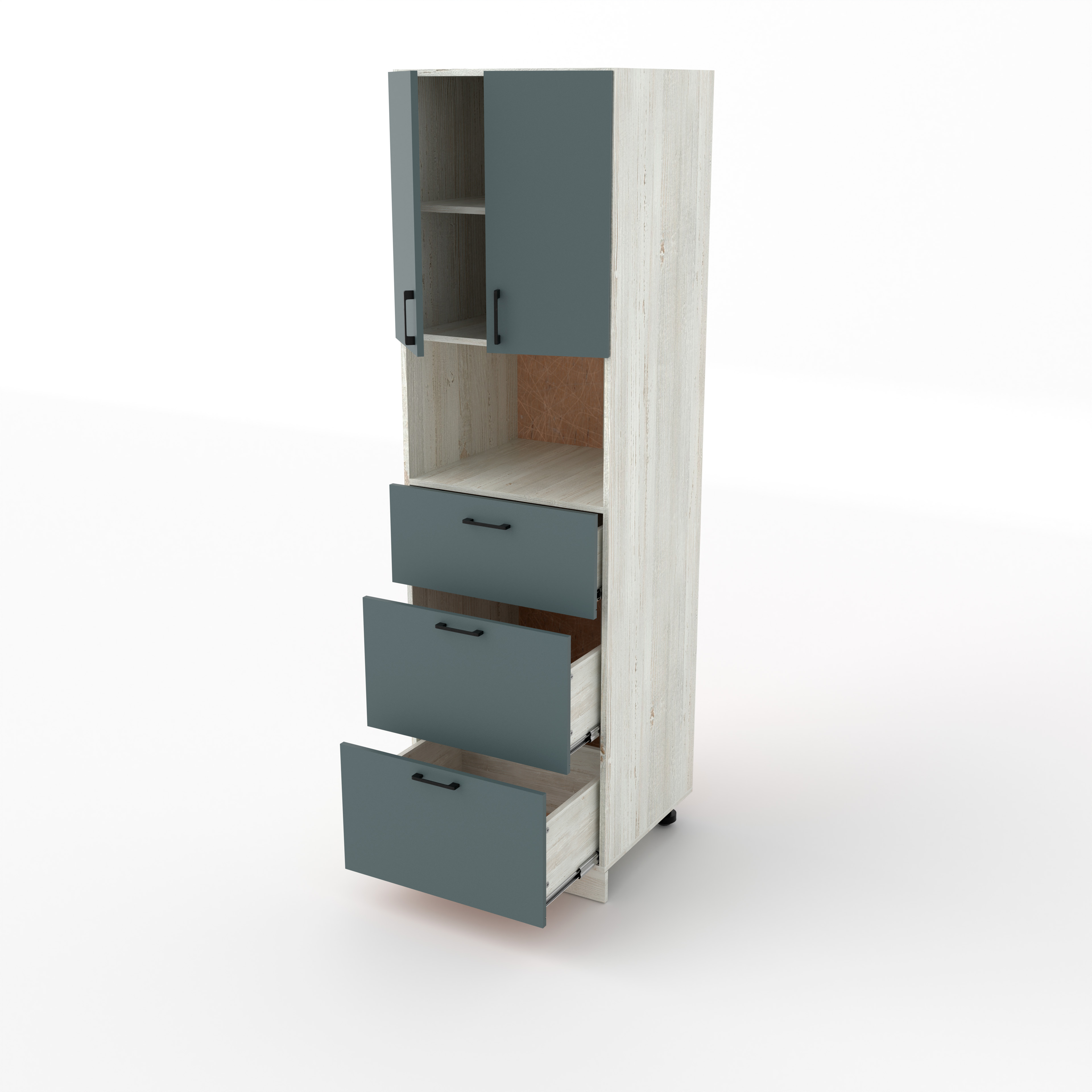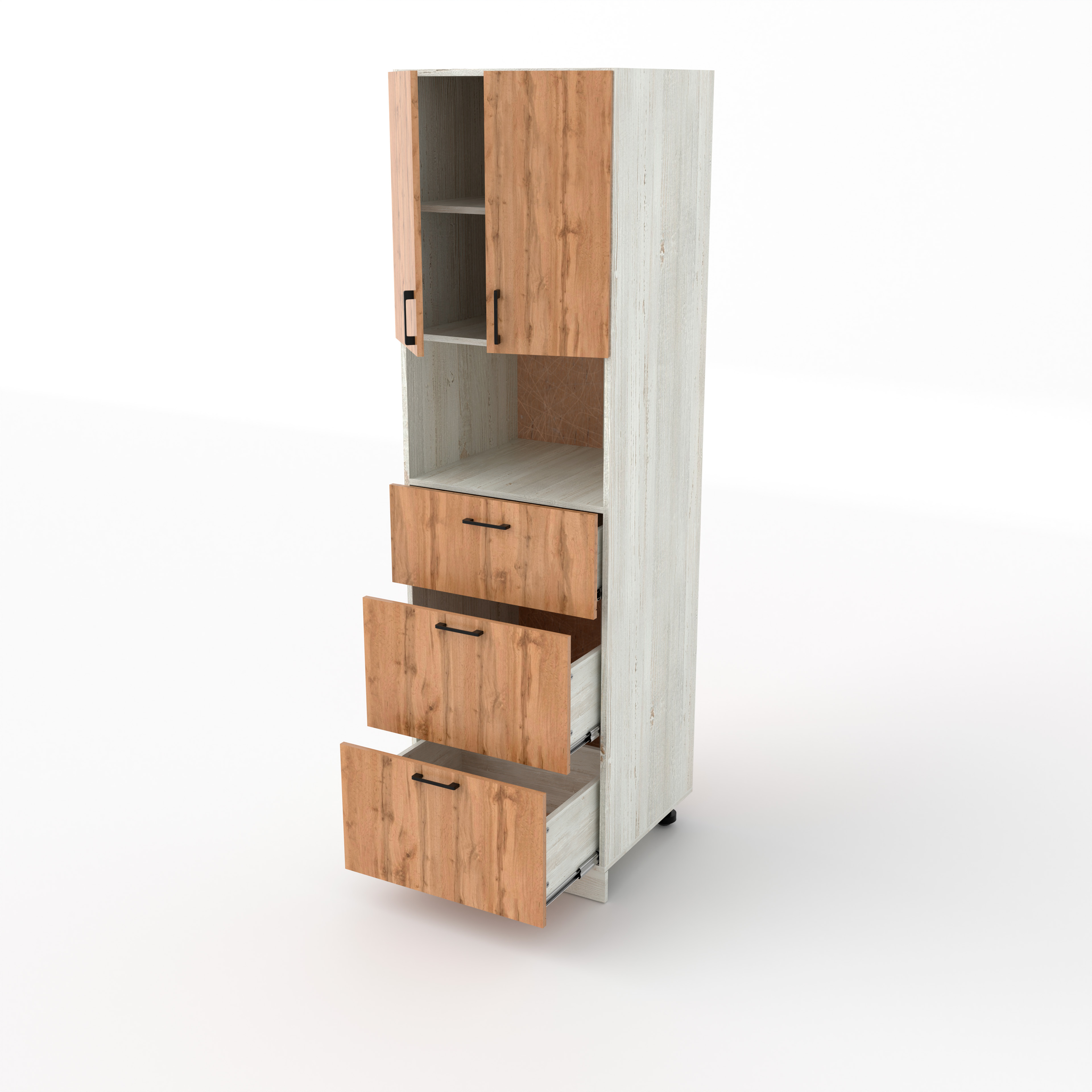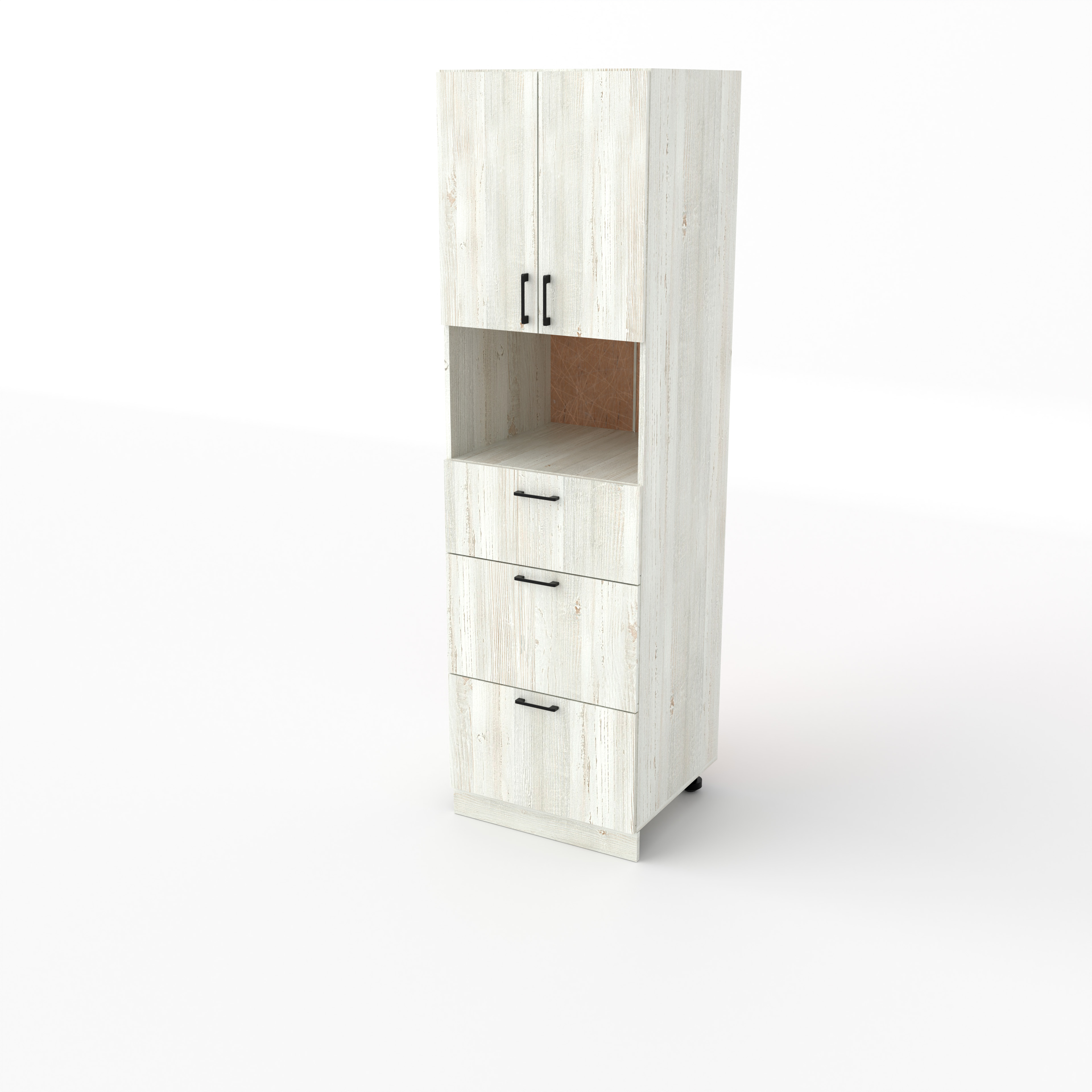 Пенал кух-ный №3 2100*600*600 Сосна - это высокая функциональная колонна, сочетающая открытую зону для техники и вместительную систему хранения. Ниша под СВЧ располагается на уровне груди или глаз для удобного доступа. Три выдвижных ящика находятся в нижней части пенала и позволяют четко разделить хранение по категориям.