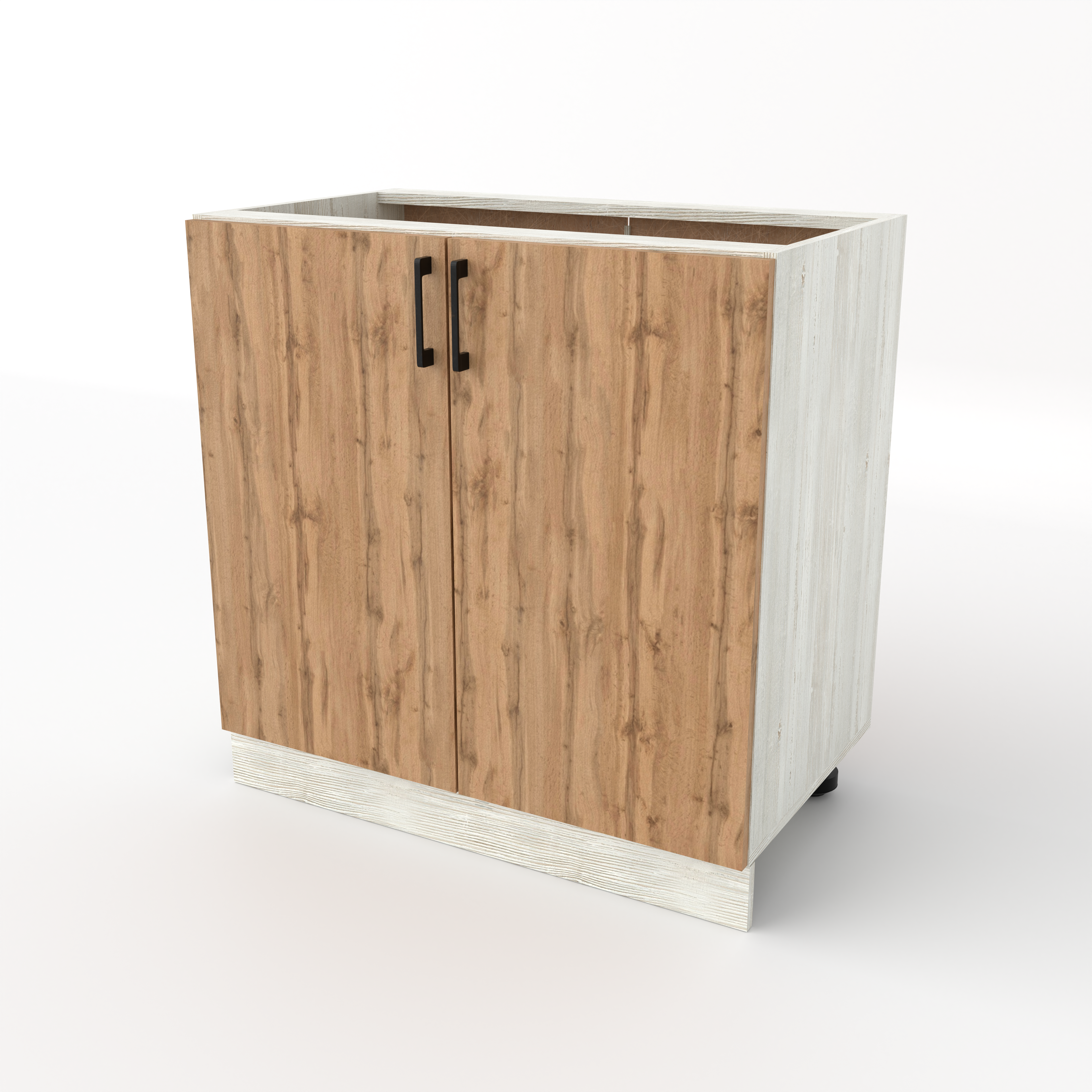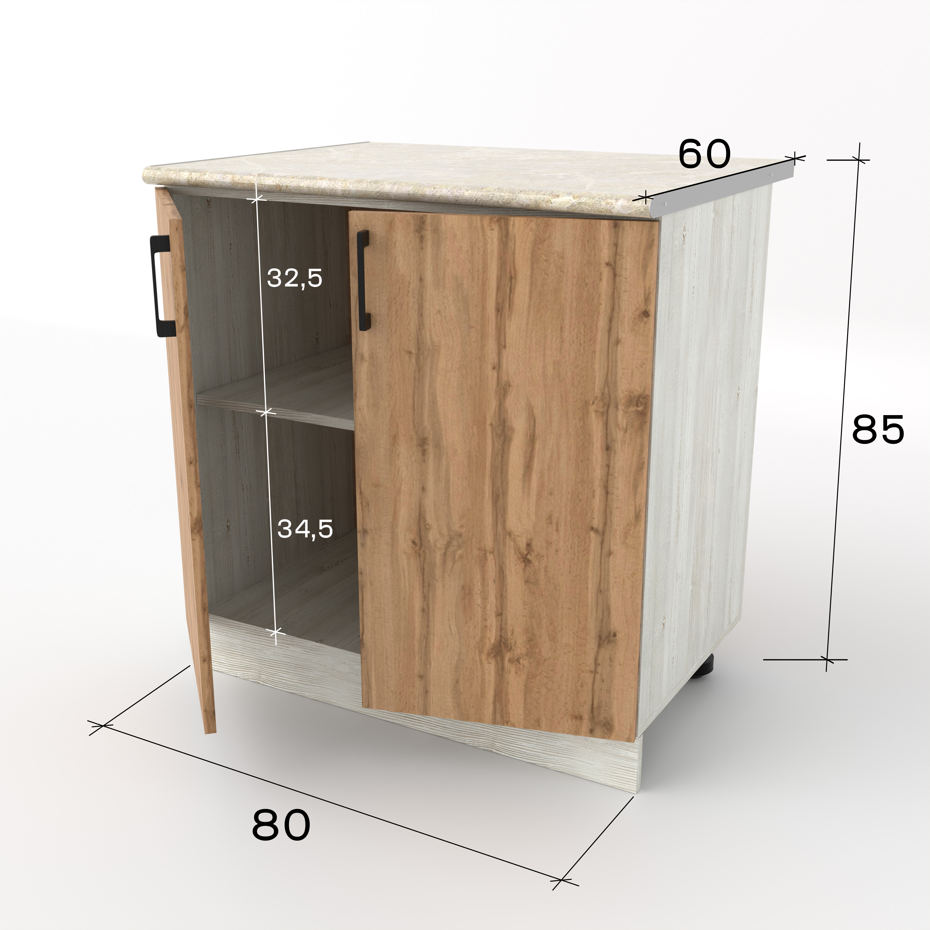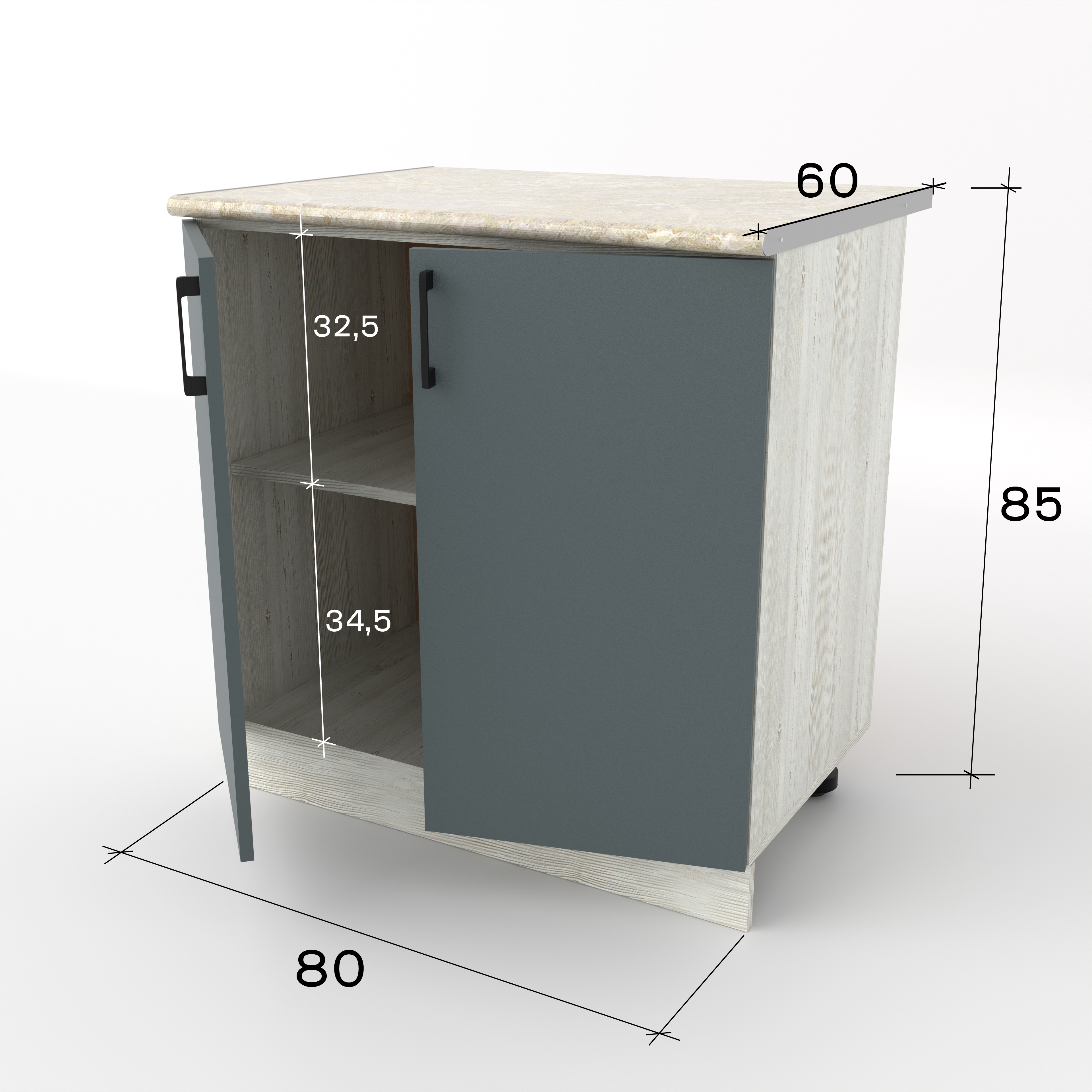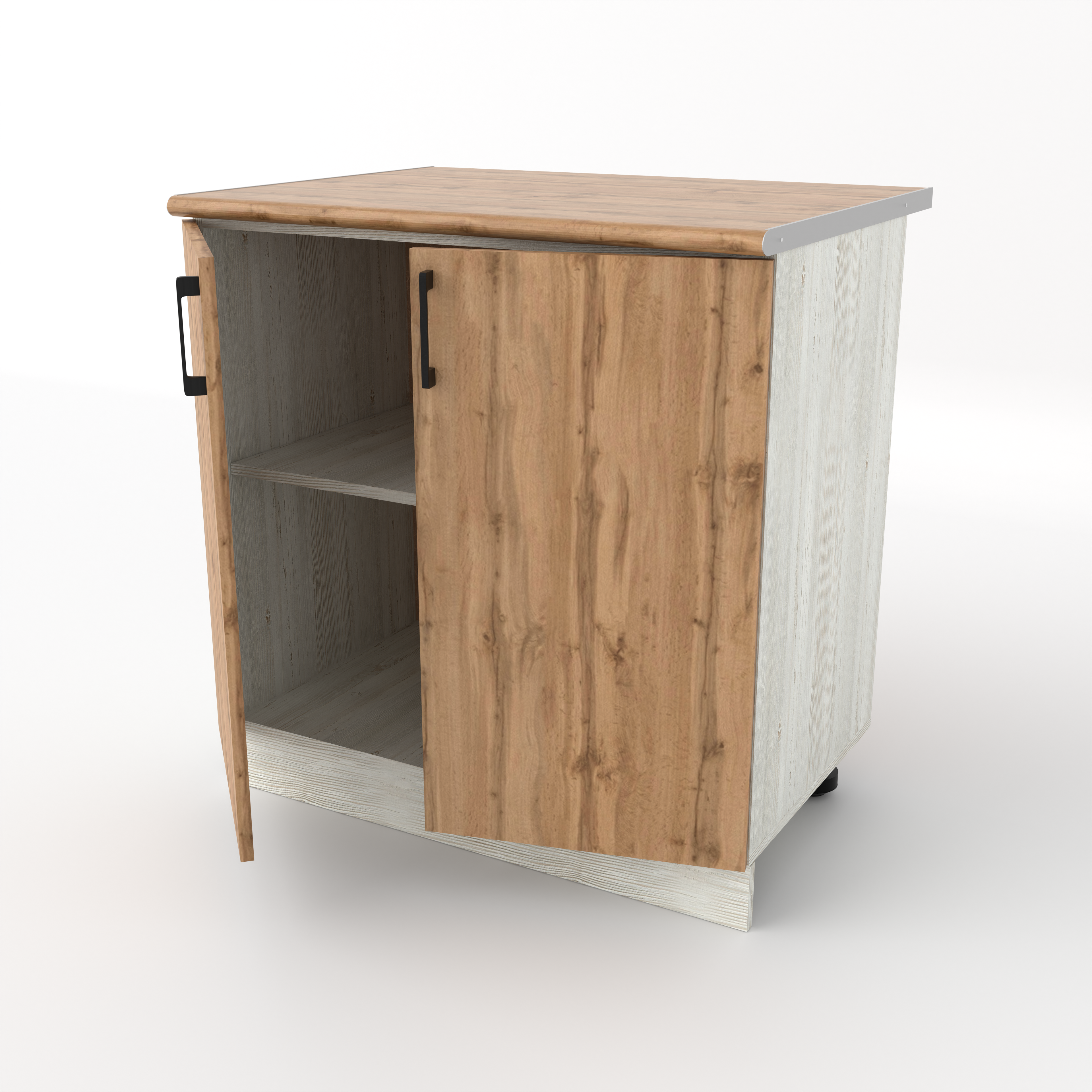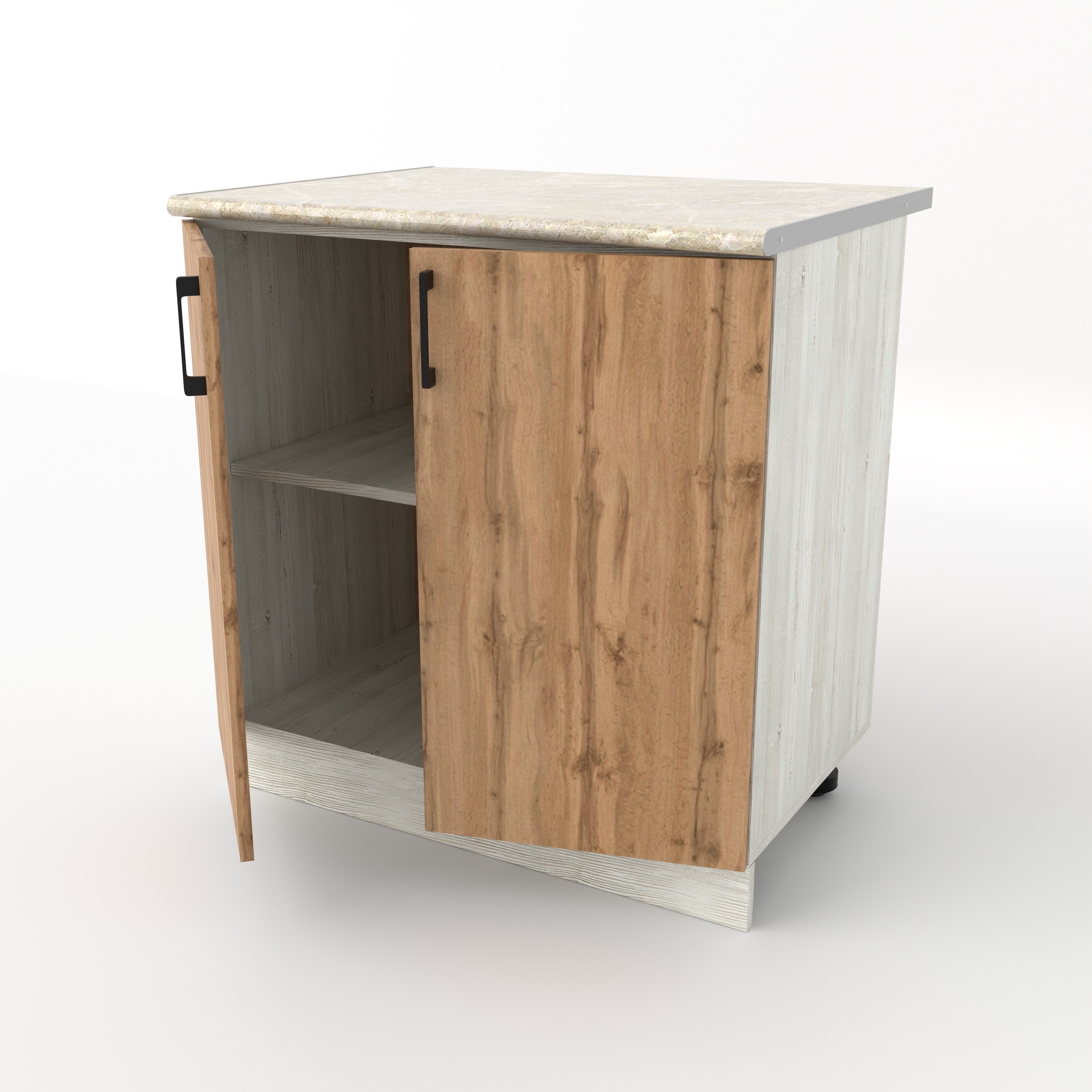Разделочный кухонный стол с двумя распашными дверцами — это классический вместительный модуль, предназначенный для хранения крупного инвентаря и подготовки продуктов. За двумя дверцами скрывается широкое общее пространство, разделенное горизонтальной полкой. Это идеальное место для громоздких предметов: кастрюль, сковородок, кухонных комбайнов или высоких упаковок с продуктами.
