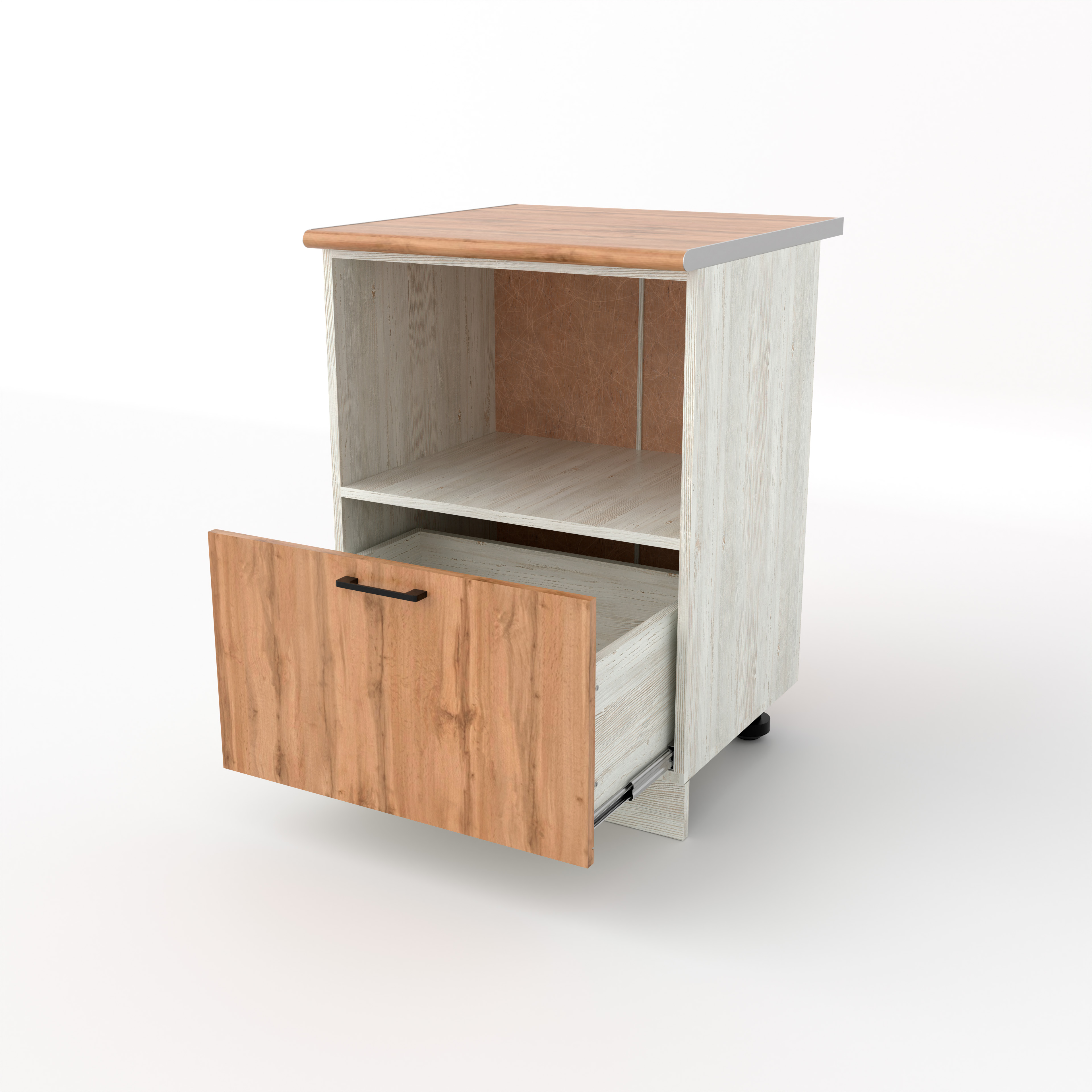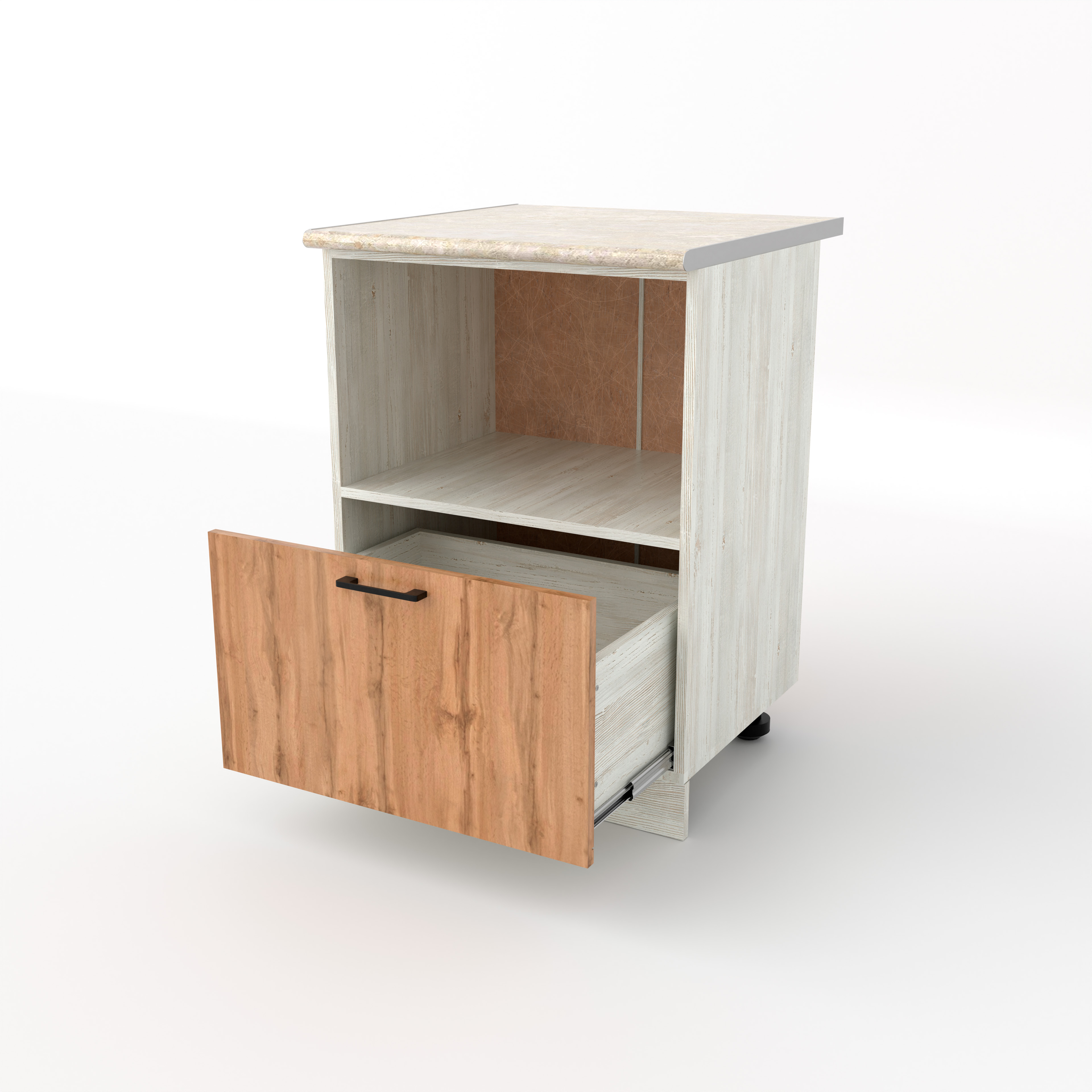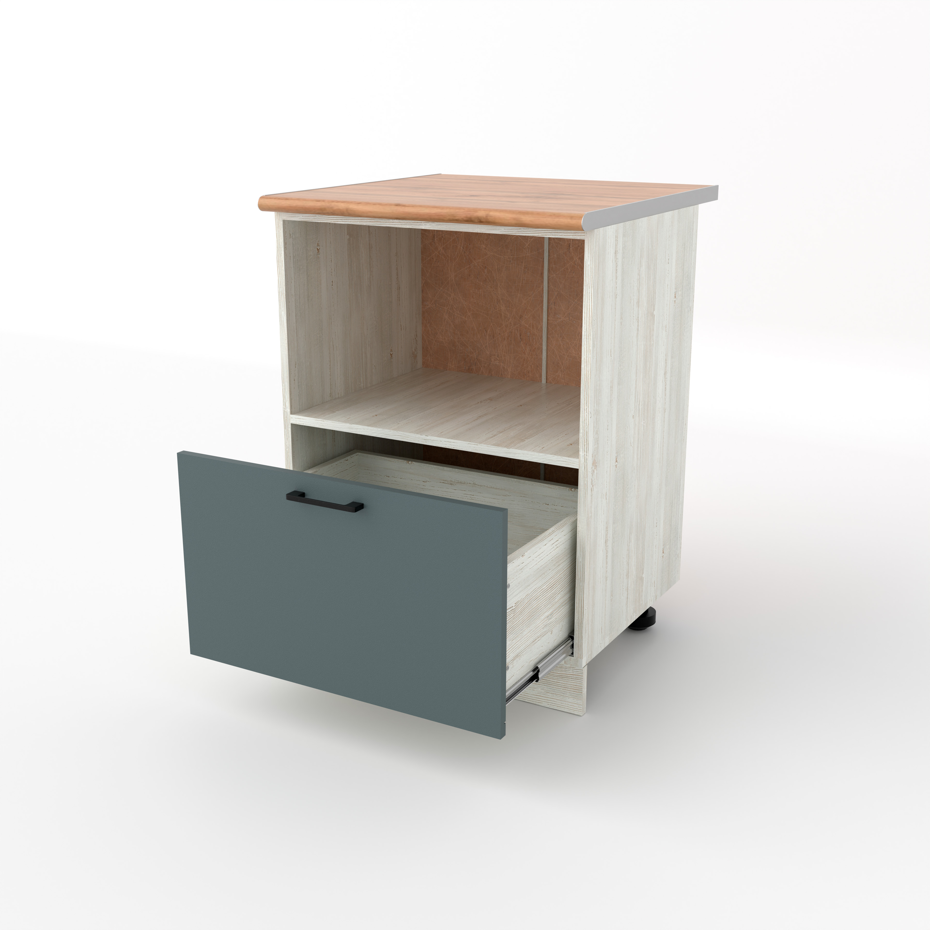 Разделочный стол под СВЧ с выдвижным ящиком — это функциональный нижний модуль, который позволяет убрать микроволновку со столешницы, сохранив при этом место для хранения. Верхняя часть модуля представляет собой полку, в которую устанавливается микроволновка. Отсутствие фасада обеспечивает свободный доступ к прибору и необходимую вентиляцию. Выдвижной ящик расположен непосредственно под нишей для СВЧ. Это глубокий и вместительный ящик, удобный для хранения крышек, контейнеров или сухих продуктов.