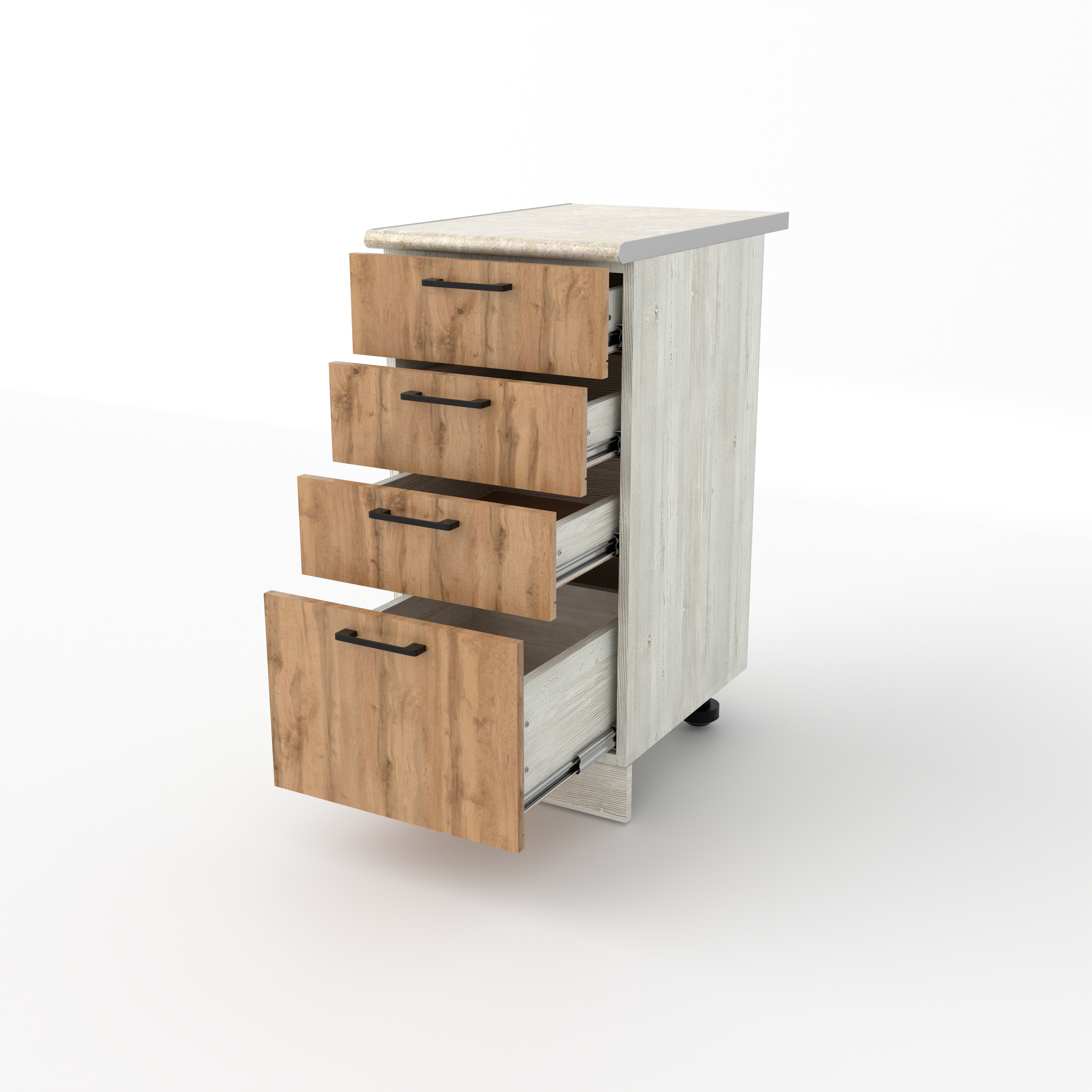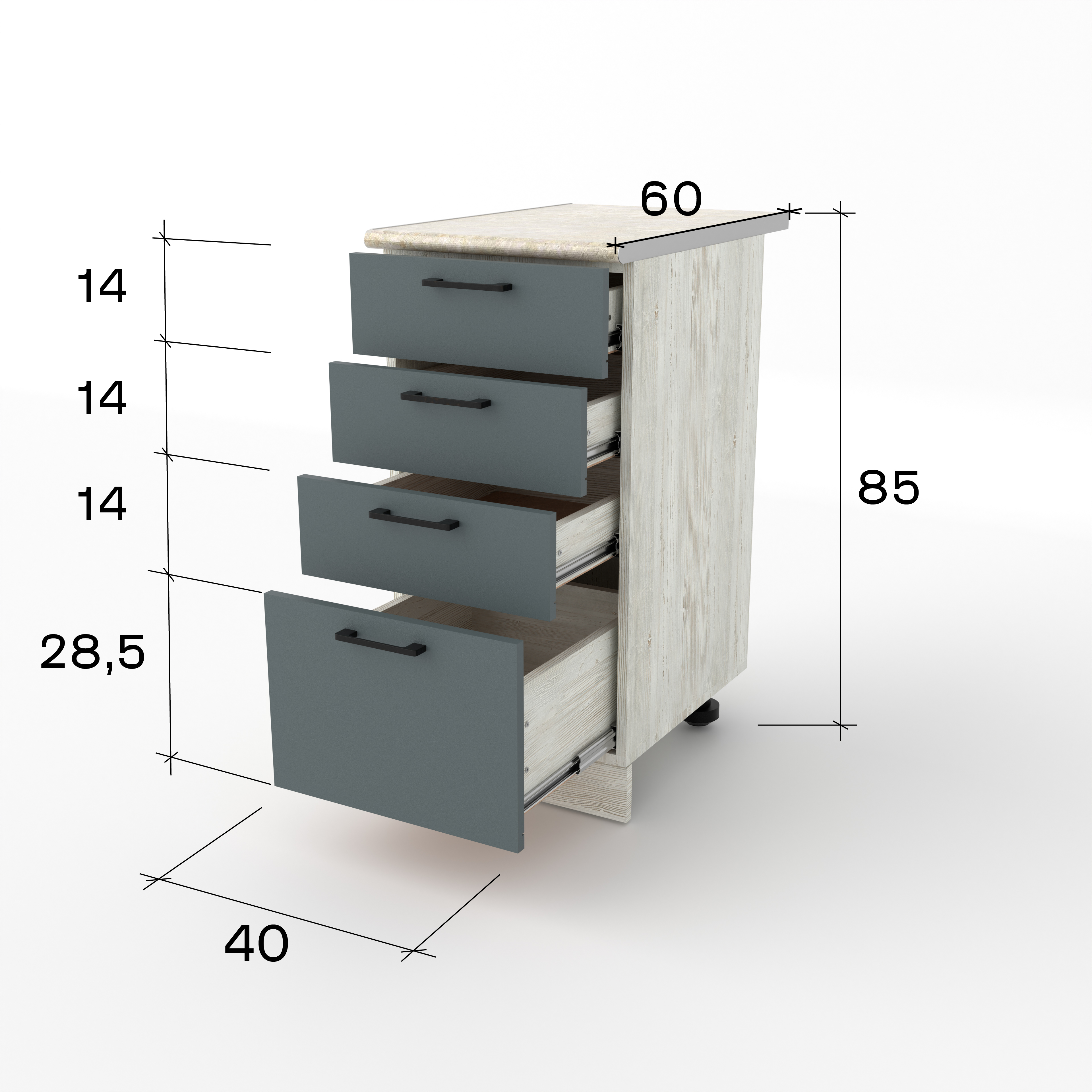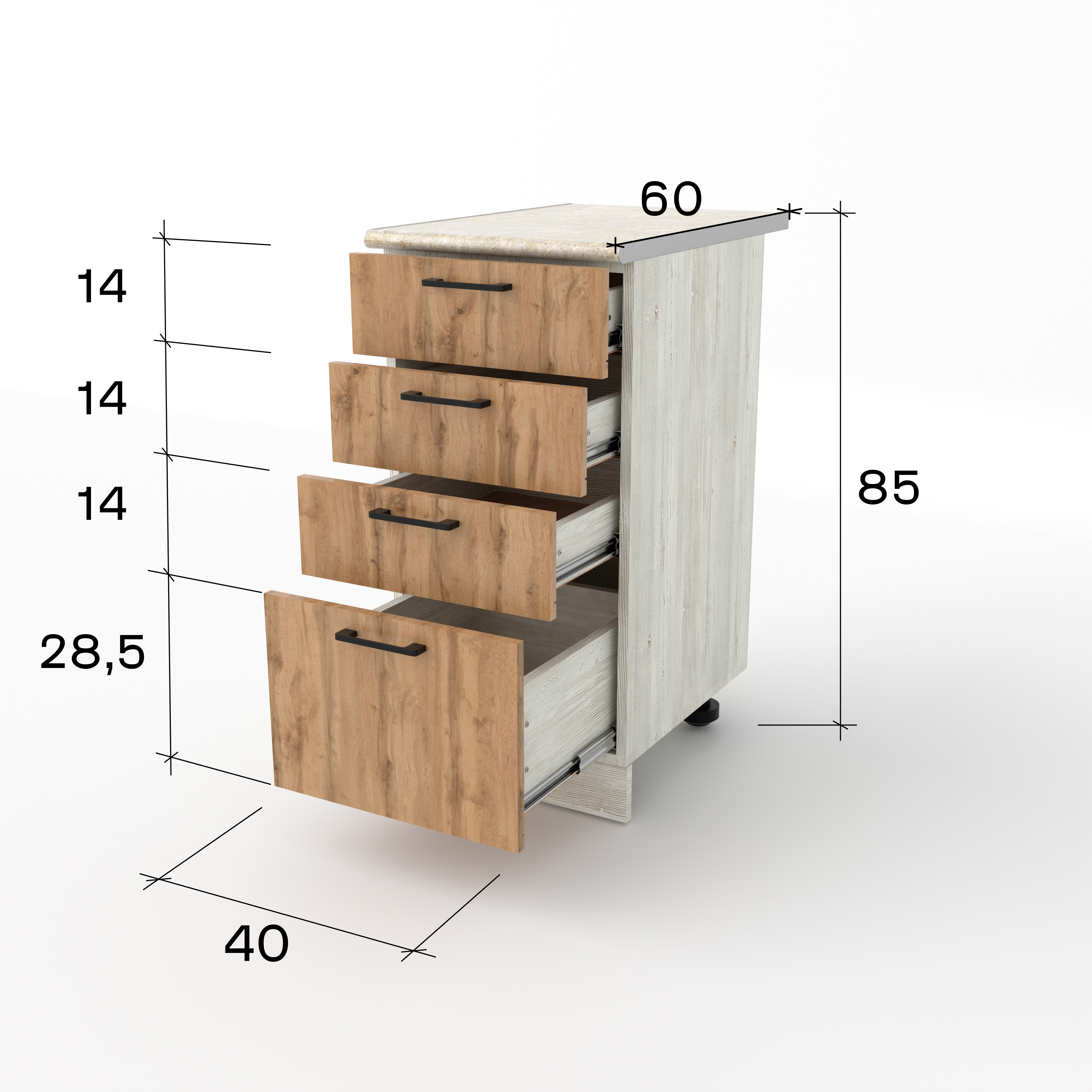 Разделочный кухонный стол с 4 выдвижными ящиками — это функциональный напольный модуль, предназначенный для хранения большого количества кухонных принадлежностей и подготовки продуктов. Верхние ящики: обычно используются для столовых приборов, ножей и мелких аксессуаров (открывашки, венчики).